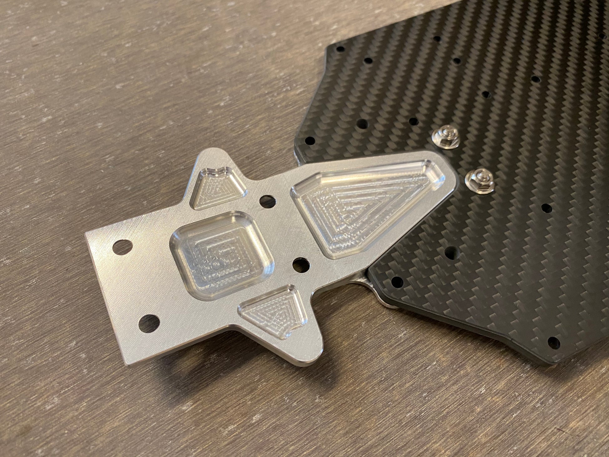 The front section is 7075 T6 aluminium, up to 7.5mm thick in critical areas. With huge strength it includes correct chassis kick up at the front to maintain correct steering geometry. Droop screw tabs benefit from the strength and hardness of the 7075.