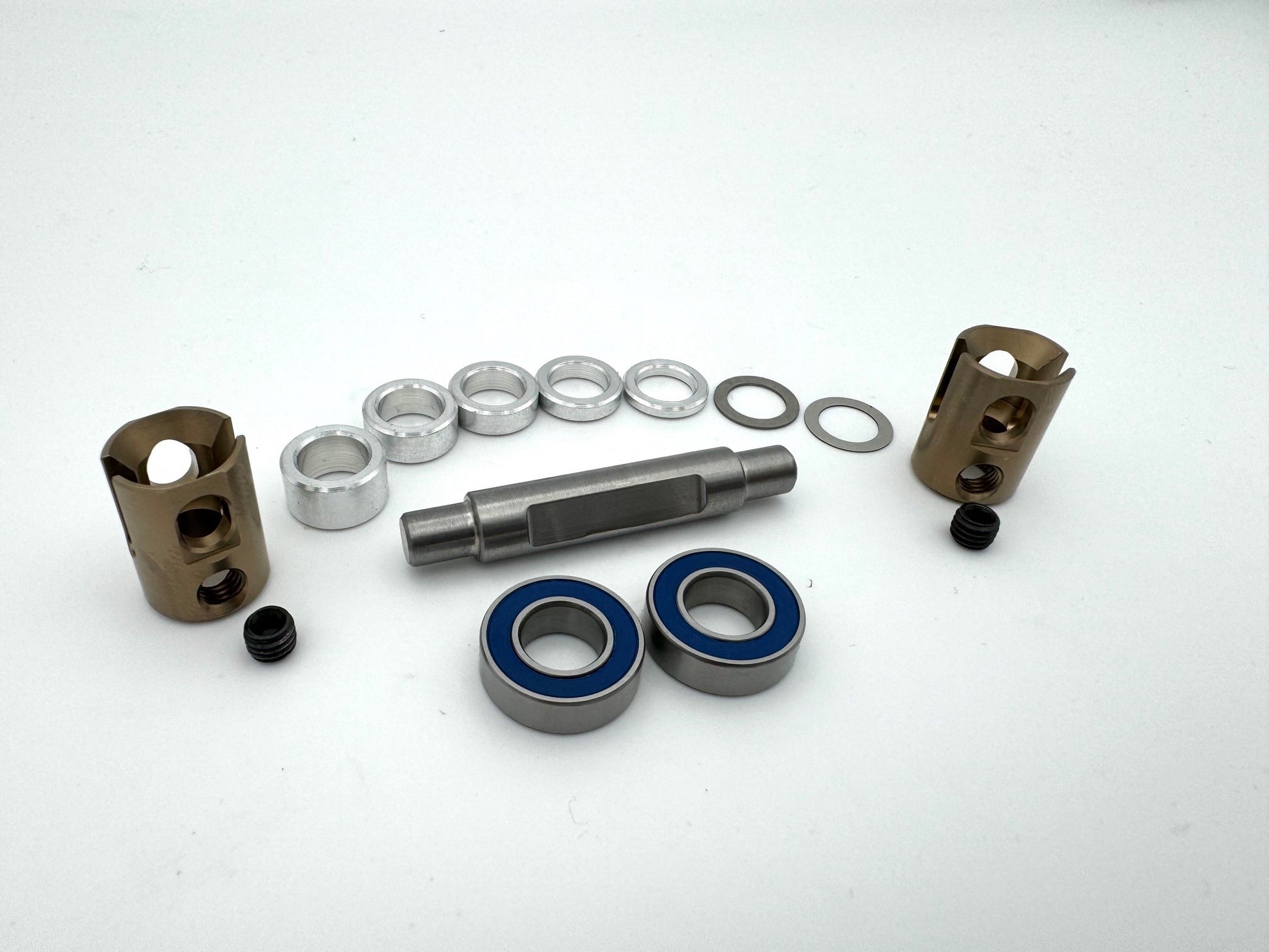 Includes grade 5 titanium center spool shaft, two 6mm bore hardened steel drive cups, two hybrid ceramic bearing and 7 piece comprehensive spur gear spacer/shim set.