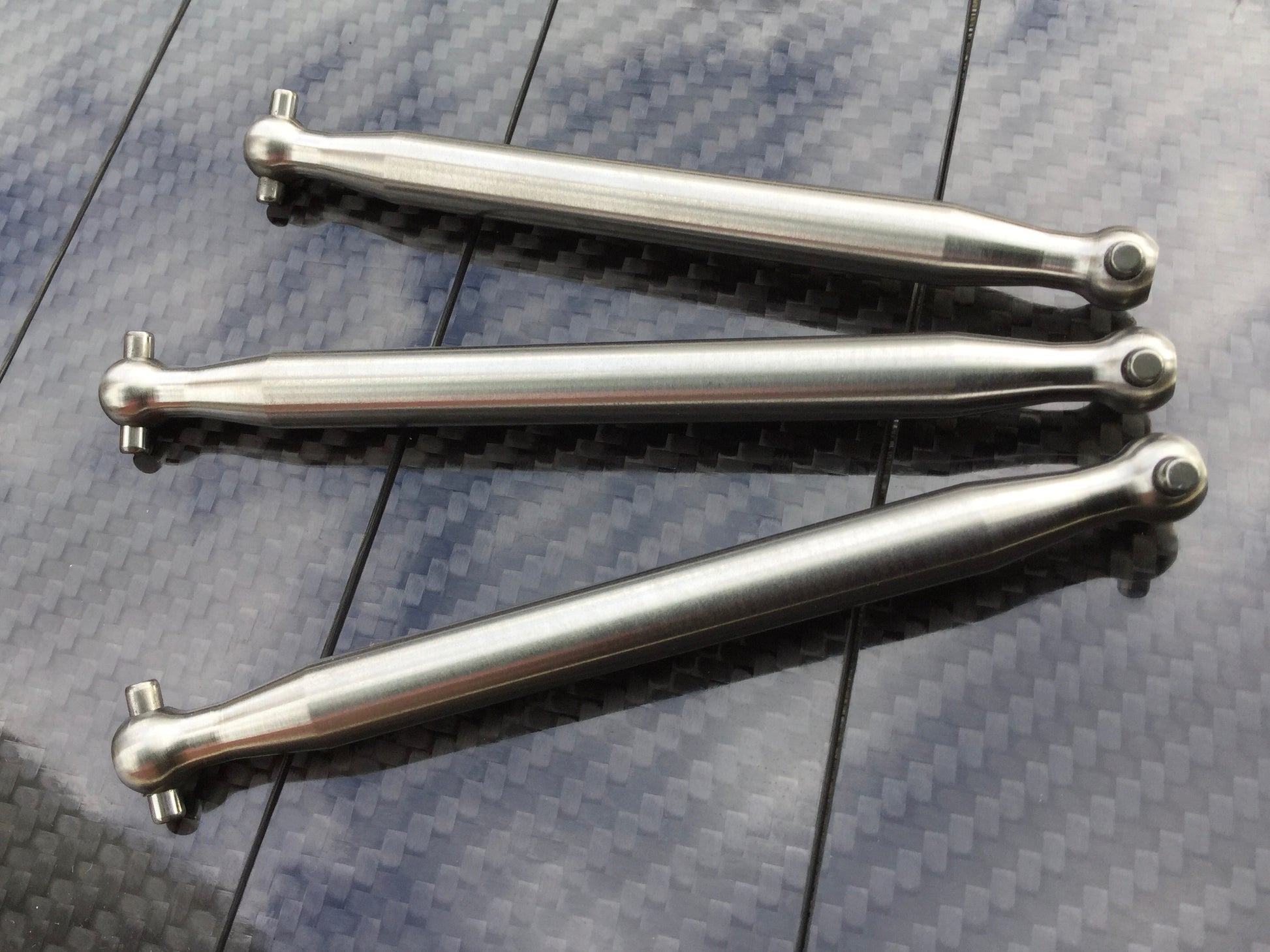 Our renown ti-6al-4v (grade 5) titanium dog bone shafts have been developed over 2 years with some of the fastest builders in the world using them. These are fully CNC machined shafts with the main diameter of the front shaft tuned to 7mm diameter to save weight and increase clearance - it's not just a plain 8mm bar. The rear shaft is machined to 8mm. 40% lighter than a similarly sized steel shaft. Our specially sourced pins are top quality hardened and tempered high carbon steel, not just cheap stock dowels.
