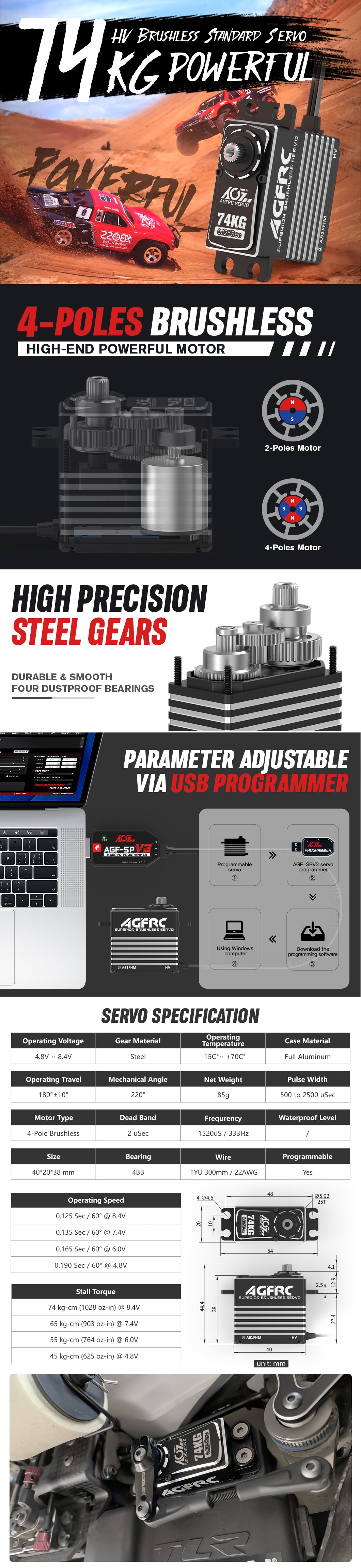 It is a programmable standard digital servo with 74KG super torque. The design feature of this new product is the use of high-quality 4-poles brushless motors, and the metal four bearing adopts dust-proof bearing, which effectively improve the product's sealing and dust-proof and splash-proof effects. Its sturdy new CNC shape adopts a fast cooling design of the heat sink, which can achieve a good heat dissipation effect while servo is working and prevent the phenomenon of being hot. It is very suitable for scenes that require large torque applications, such as some large rc aircraft, 1/8 1/10 scale rc off-road vehicles, monster trucks, and crawler car competitions.