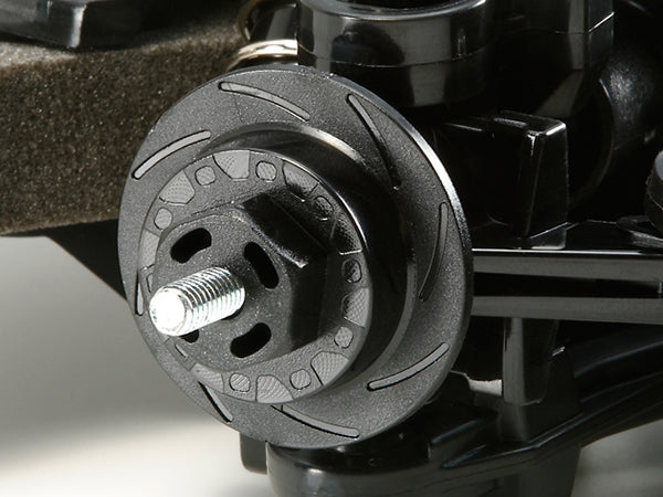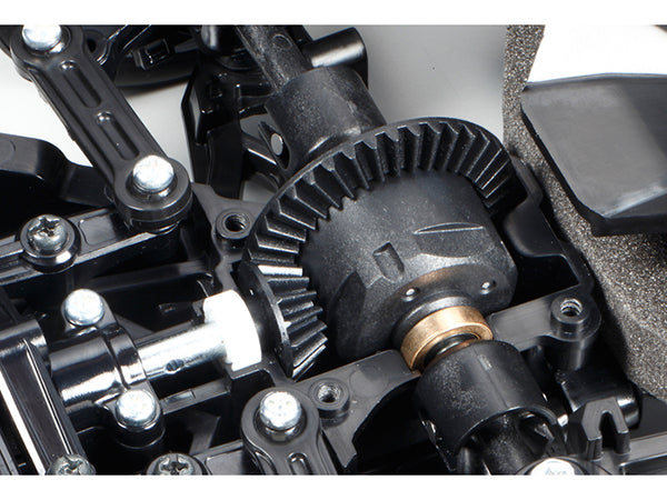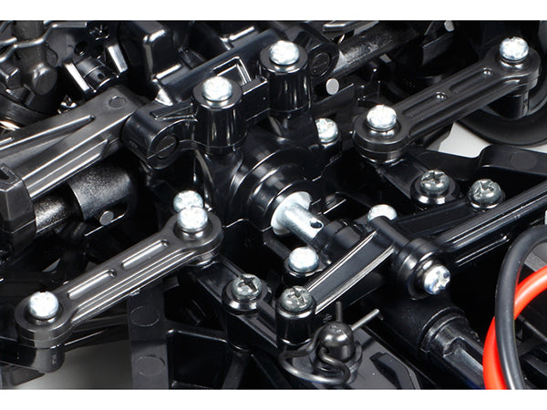 The 4-wheel independent double wishbonesuspension features friction dampers and uses identical L/R suspension arms and uprights forease of assembly and maintenance.70T spur gear and 22T pinion gear fitted as standard. The motor and the battery are longitudinally-placed in the ABS resin chassis for excellent balance.