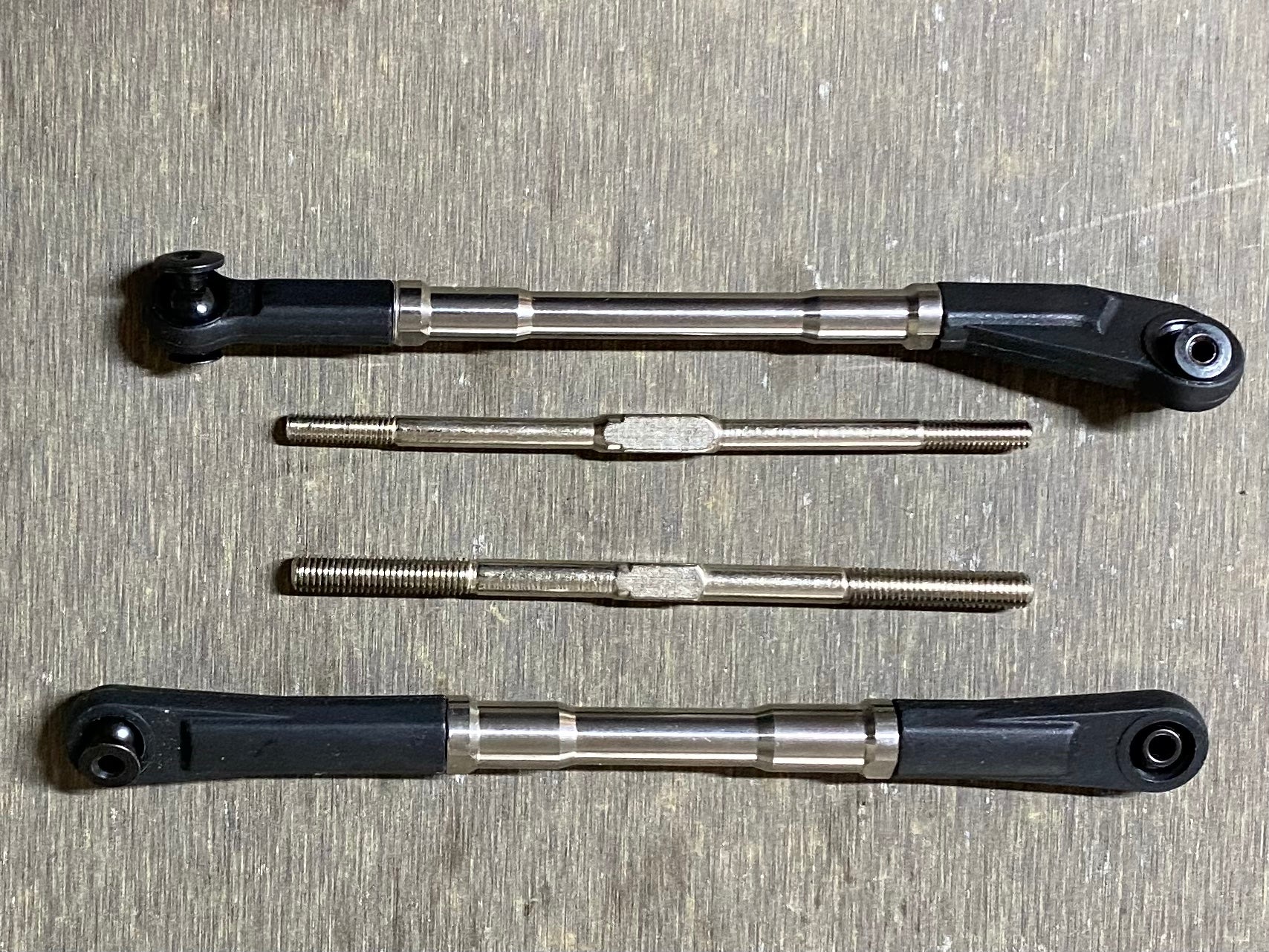 Kit includes 2 pair of link assemblies. 1 set of M4 front steering rods. One set of M5 rear upper tie rods.