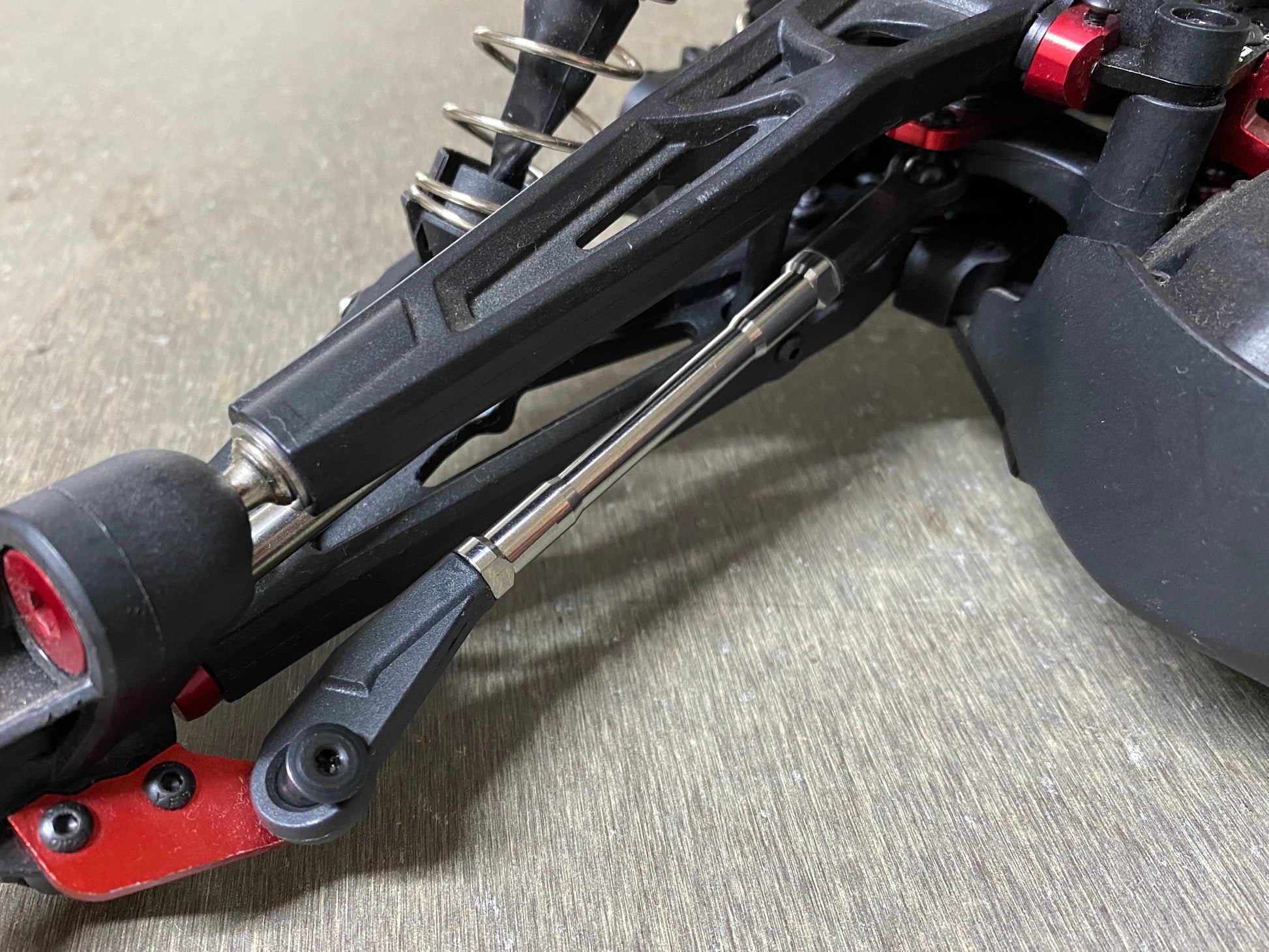 Length adjustment is achieved using 0.2mm spacing shims. 8xM4 and 8xM5 stainless steel shims are provided. For stock settings use 1 shims in each front link and 2 shim in each rear link.